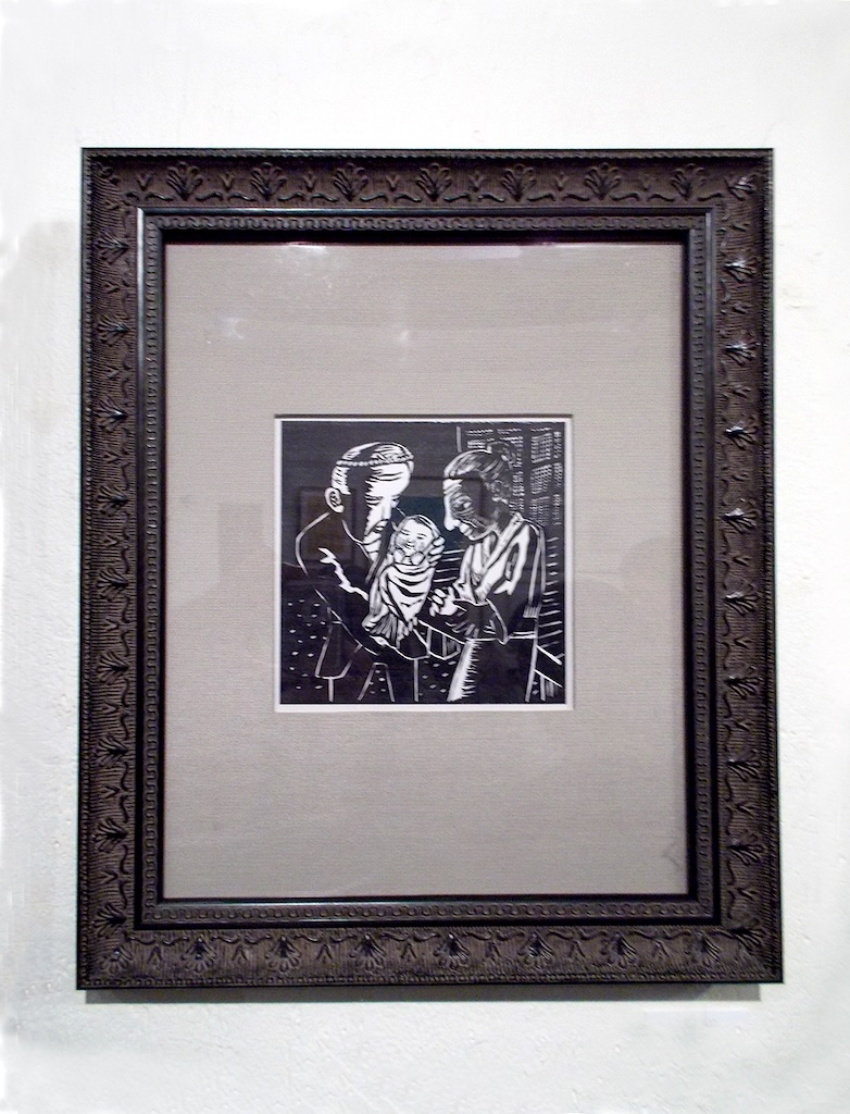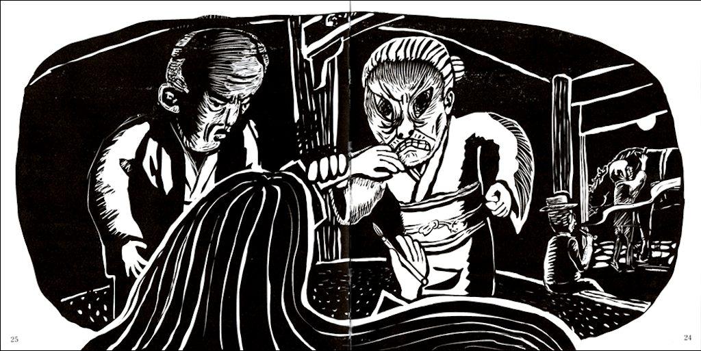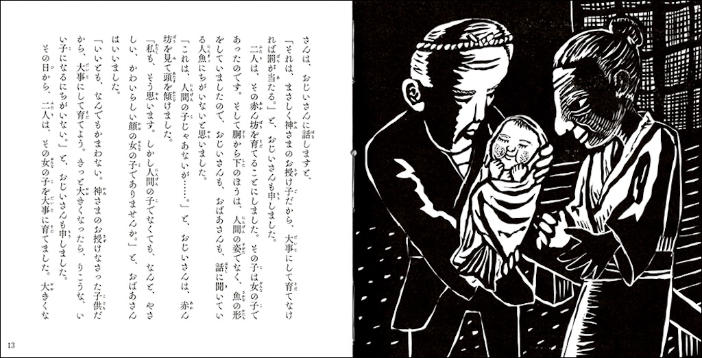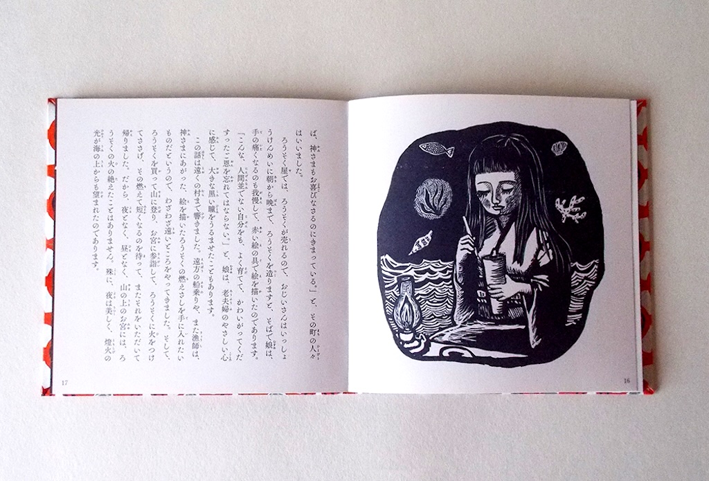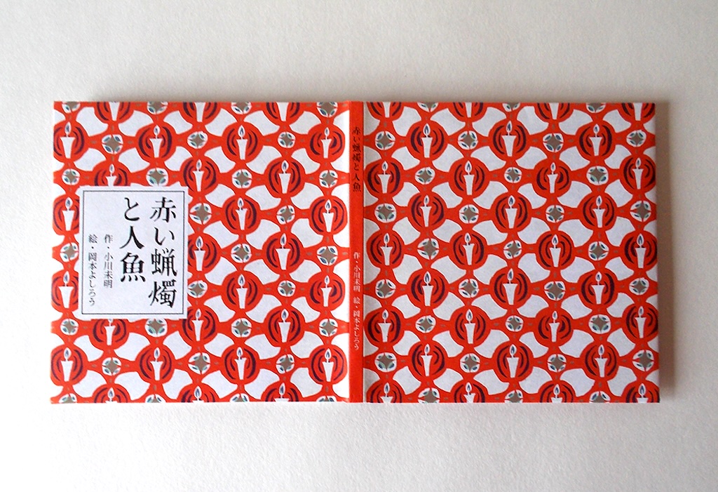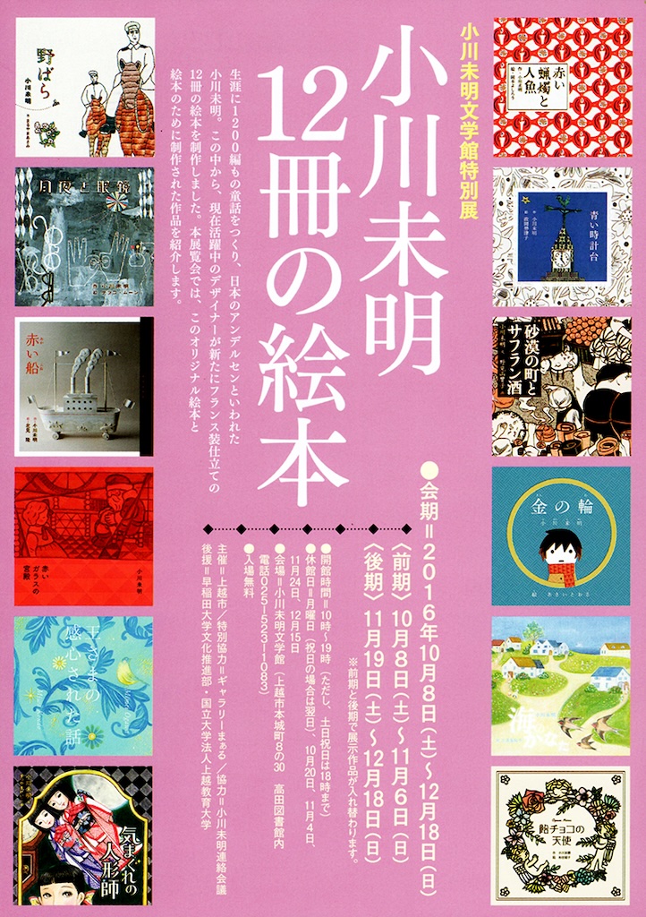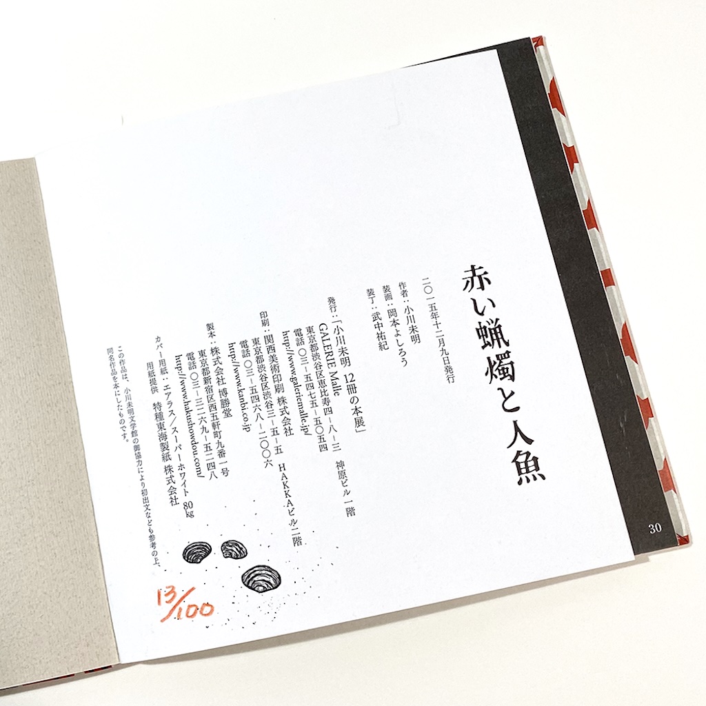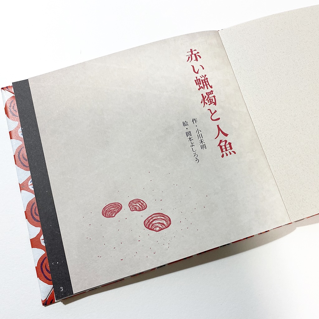 日本のアンデルセンとも呼ばれている“小川未明”をテーマとしたギャラリー企画によるグループ展。デザイナーの菊池千賀子さんディレクションのもと、フランス装で製本した12 冊の絵本が完成しました。岡本よしろうは「赤い蝋燭と人魚」の装画をデジタルで版画風に制作し、チームを組んだデザイナーの武中祐紀さんがレトロ調の装丁を施し、大正時代の絵本のように仕上げました。この展示は翌年、新潟の小川未明文学館へ巡回されました。